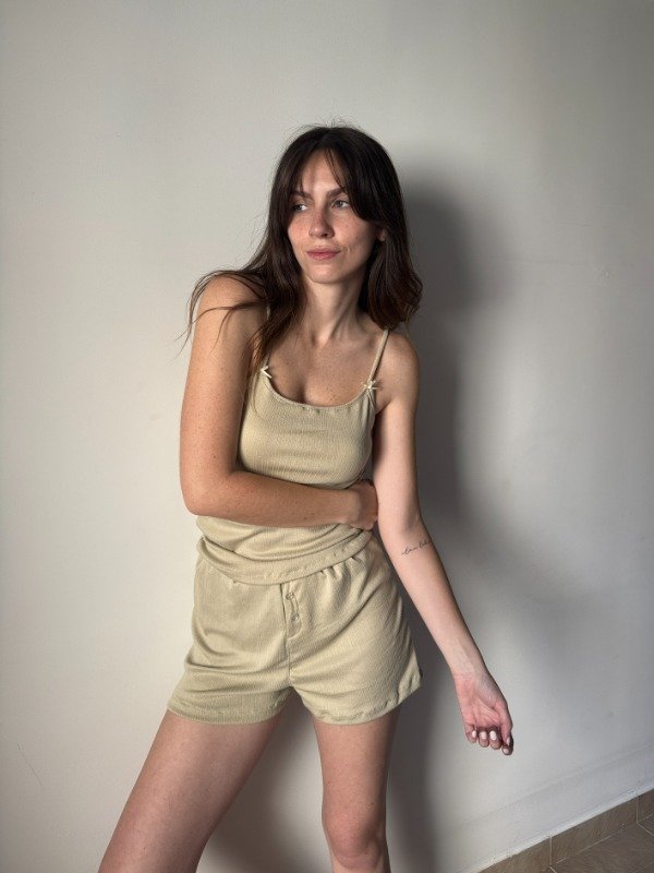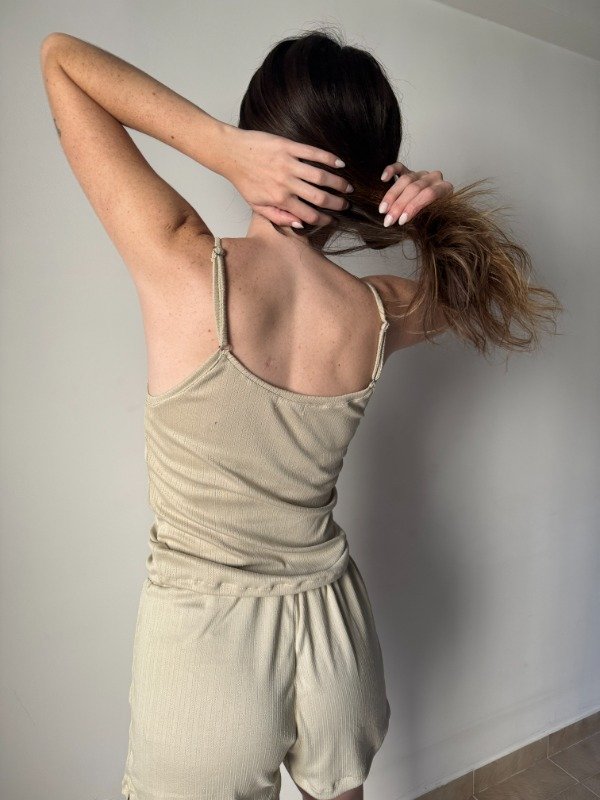 El pijama Renata es de morley con textura con musculosa con argollas regulables con detalle de moñitos; con un short con cintura elastizada con botoncitos y un moño.